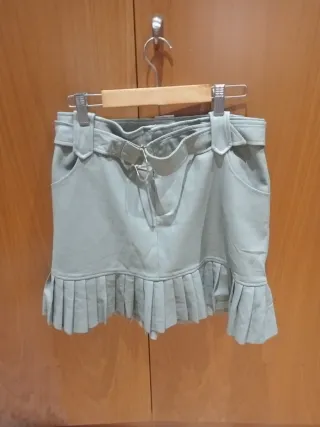 Falda de cuero en color verde, con un diseño moderno y detalles únicos. - Cinturón incluido. - Bajo con plisado y volante. - Bolsillos laterales.