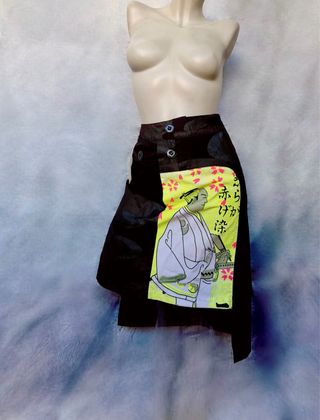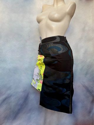 Medidas: cintura 41cm, largo (lado izquierdo) 64.5cm (lado derecho) 52cm Falda asimétrica de Custo Barcelona con un diseño llamativo. - Estampado frontal con figura japonesa. - Detalle de volantes. - Cierre de botones.