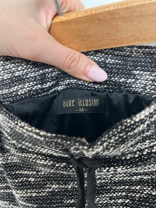 Mini falda trapecio de rayas de Mango Color: blanco y negro Talla S Cierre con cremallera invisible lateral Tiene un pequeño hilo tirado (ver foto 3 por favor) que se puede volver a poner en su sitio con una aguja de coser. El resto está perfecto. Usada dos veces.