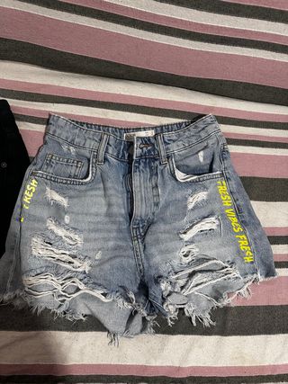 Shorts vaqueros de corte moderno con detalles desgastados y texto. - Diseño con rotos y deshilachados. - Inscripción FRESH VIBES FRESH en amarillo en los laterales.