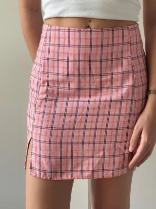 Minifalda de cuadros en tonos rosas y naranjas. - Talla S - Diseño de cuadros pequeños. - Corte a la altura de la mini falda. - Tiene aberturas laterales.