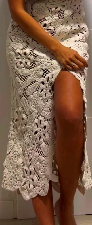 Preciosa falda midi de la línea premium de H&M en color crema/crudo. Pieza espectacular con un trabajo de bordado complejo hecho en India, con diseño calado y transparencias muy finas y suaves. Estado: Impecable, tal como se ve en las fotos. La etiqueta marca Talla XS, pero gracias a su cintura elástica se adapta a otras tallas, en las fotos la llevo yo (mido 1,63 m y peso 53 kg). Mis medidas son 91-71-95 (suelo usar S/M o 36-38) y me queda perfecta, muy cómoda. Cierre de cremallera invisible en la espalda con gancho de seguridad.Abertura lateral (slit) que estiliza mucho la pierna. #CrochetSkirt #BohoChic #SummerVibes #MidiSkirt
