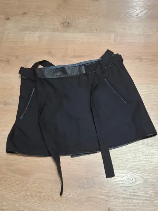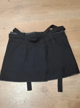 Falda de cuero con un diseño moderno y elegante. La pieza tiene un corte que estiliza la figura. - Material: Cuero. - Diseño con costuras marcadas. - Detalle en la cintura con botón. - Vintage
