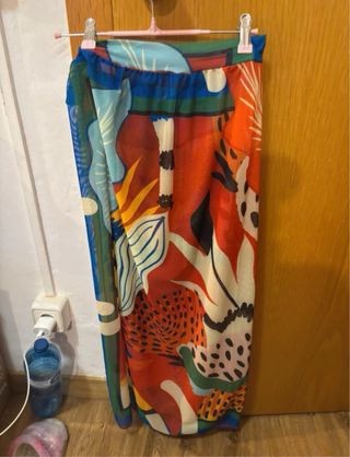 Falda larga con un vibrante estampado tropical, ideal para el verano. Su diseño ligero y colorido la hace perfecta para cualquier ocasión. - Tejido vaporoso y transpirable. - Estampado multicolor con motivos botánicos y abstractos. - Cintura elástica para mayor comodidad.