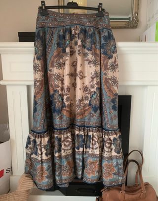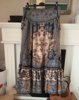 Falda larga con un estampado floral y paisley en tonos beige y azul. Presenta un diseño con vuelo y volantes en el bajo. - Estampado floral y paisley. - Diseño con vuelo. - Volantes en el bajo. - 100% seda Nunca usada.