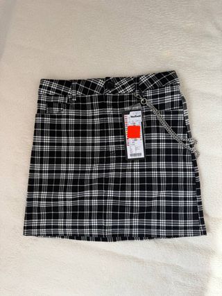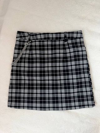 Falda con estampado de cuadros escoceses en blanco y negro. Presenta un diseño moderno con detalles metálicos. - Estampado de cuadros. - Cadena decorativa. - Cierre de botón y cremallera.