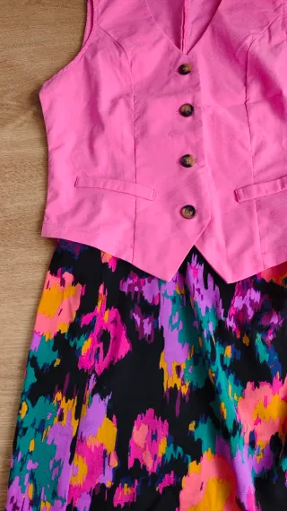 Conjunto de falda y chaleco con un diseño vibrante. - Chaleco rosa sin mangas, talla M. - Falda con estampado floral abstracto talla L. - Detalle de volantes en la falda.