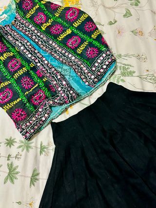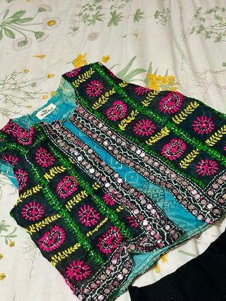 Conjunto de chaleco reversible con bordados y falda. - Chaleco con diseño multicolor y detalles de espejos. - Falda negra lisa.