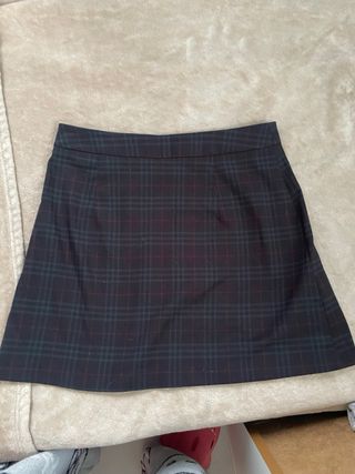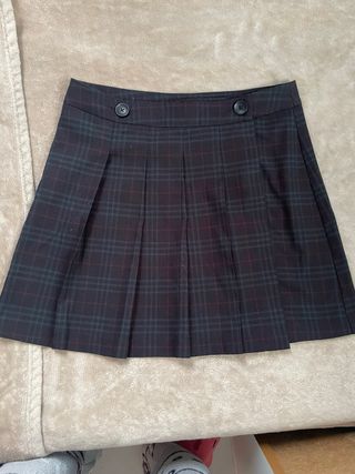 Falda corta con estampado tartán en tonos grises , azules y marrones. Presenta un diseño con pliegues y dos botones en la cintura. - Estampado tartán - Dos botones en la cintura - Diseño con pliegues -No estira -Medidas: cintura 83cm , cadera 1m , largo 42cm