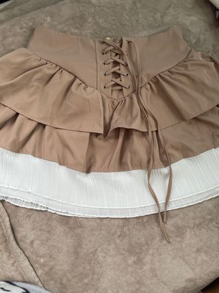 Falda de estilo moderno con detalles únicos. - Diseño con cordones en la cintura. - Capas de volantes. - Parte inferior con tejido plisado.