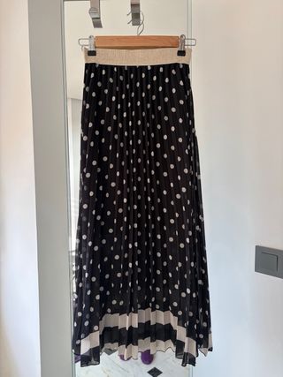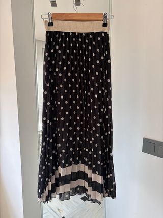 Falda larga plisada con estampado de lunares. - Cintura elástica. - Detalle de rayas en el bajo. -Con forro