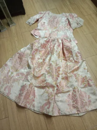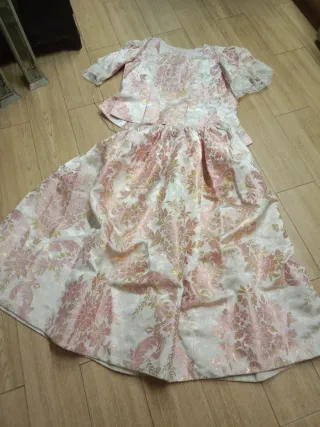 Falda con un diseño floral y detalles dorados. Medidas largo 80, cintura ajustable con lazo. El corpiño va de regalo ya que tiene varios desperfectos, medidas 50 largo y 43 sisa - Estampado floral en tonos rosas y dorados.