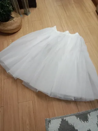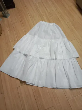 Este can can blanco añade volumen y movimiento a faldas y vestidos. Tiene unas manchas que se ven en la última foto. Medida largo 90cm. - Diseño de tres volantes. - Cintura elástica.