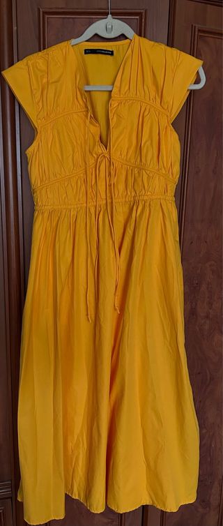 Vestido largo de color amarillo vibrante. Presenta un diseño con fruncidos en el corpiño y cordones para ajustar. - Escote en V con cordones. - Mangas cortas abullonadas. - Cintura elástica fruncida. - Falda larga y fluida.