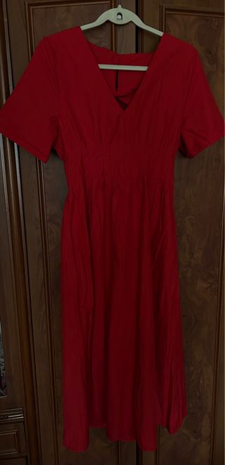Vestido largo de color rojo, ideal para ocasiones especiales. Presenta un diseño con escote en V y mangas cortas. - Escote en V con detalle cruzado. - Cintura elástica para un ajuste cómodo. - Falda larga y fluida.