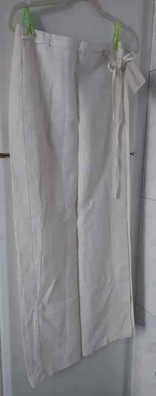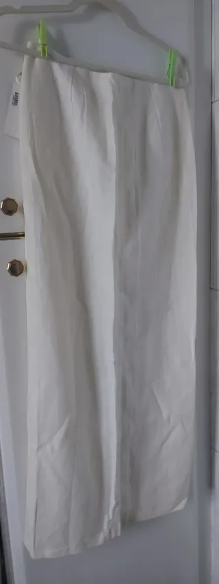 Falda pareo de lino y algodón, sin estrenar. Un diseño elegante y versátil. Pone talla 44 pero yo creo es una 40/42 - Cierre con lazada y botón. - Detalle de costuras. - Corte amplio.