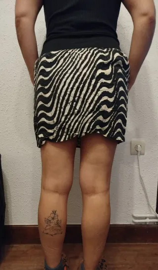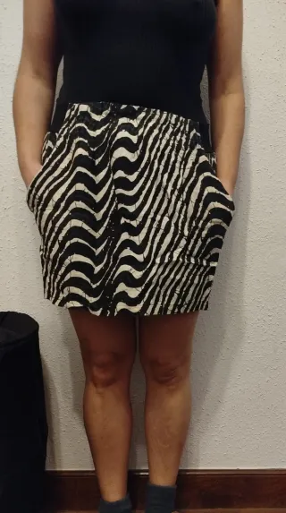 Falda corta con estampado animal print de zebra - Cintura elástica. - Bolsillos laterales. - Largo hasta el muslo.