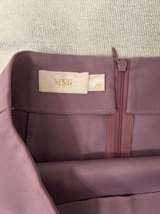 Falda midi de Mango en un bonito tono morado. Su diseño es elegante y versátil. En muy buen estado - Largo por la rodilla. - Corte recto. - Aberturas en el bajo.