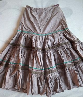 Falda midi con un diseño bohemio y detalles de volantes. - Tejido ligero y vaporoso. - Varios niveles de volantes. - Adornos de cinta en color verde y marrón.