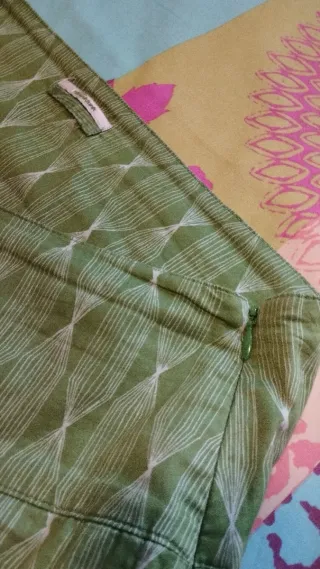 Falda con un estampado geométrico en tonos verdes y blancos. El diseño presenta rombos formados por líneas finas que se irradian desde un punto central. - Etiqueta de la marca visible.