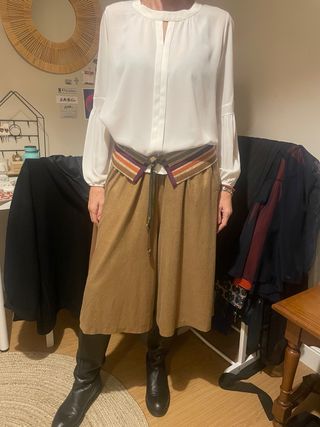 Prenda de Elisa Rivera, una falda pantalón de color beige con una capa externa de la tela para poder convertirla en falda - Diseño modificado. - se adjunta bando de Rivera y camisa no a la venta