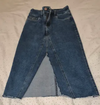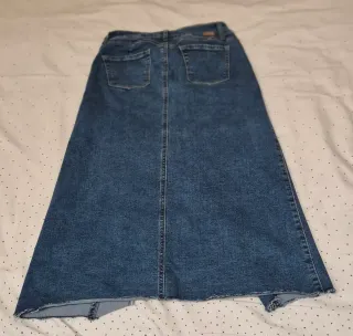 Falda vaquera midi con un diseño moderno y favorecedor. - Corte midi a media pierna. - Detalle de abertura frontal. - Acabado desgastado en los bajos.