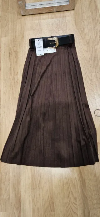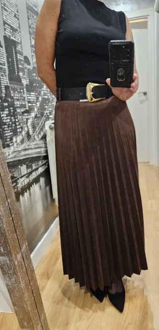 Falda larga plisada en color marrón chocolate. Es de esta temporada. La tela es gordita aunque a la vista parece ligera. Nueva con etiquetas. - Incluye cinturón negro con hebilla dorada.