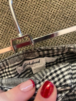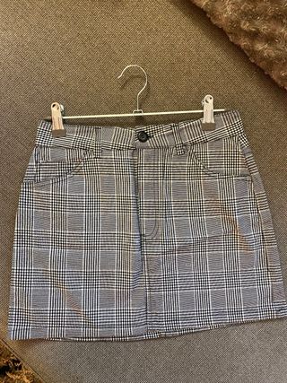 Falda corta con estampado de cuadros. - Diseño de cuadros en tonos grises y negros. - Cintura con trabillas para cinturón. - Cierre de botón y cremallera. - Bolsillos delanteros.