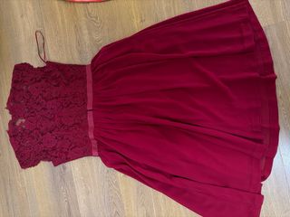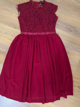 Elegante vestido en color vino, perfecto para eventos especiales. - Cuerpo de encaje con cuello alto. - Manga corta de encaje. - Cinturón fino de satén. - Falda de gasa con vuelo.