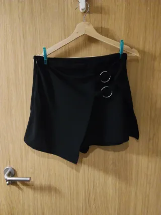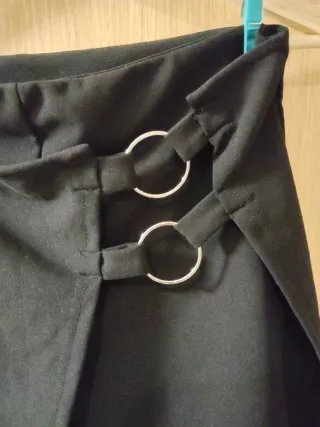 Falda pantalón de color negro con un diseño moderno y detalles metálicos. - Detalle de aros metálicos en la parte frontal. - Diseño tipo falda con corte asimétrico.