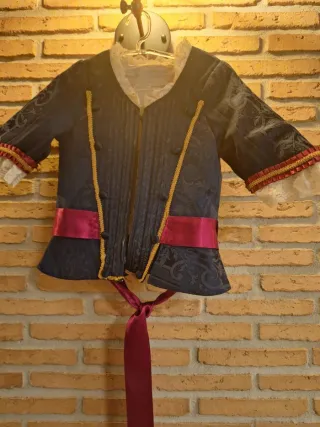 Conjunto de falda, corpiño y mantoncilloLa falda mide 75 cm de cintura y 1 mt de larga - Diseño con detalles ondulados en contraste. - Falda con volantes y cintas decorativas.Esta confeccionada a medida