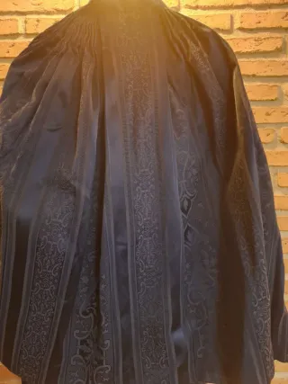 Traje tradicional de labradora o fallera, con un diseño muy elaborado. - Tejido brocado con motivos florales y dorados. - Cuerpo entallado con detalles plisados. - Falda amplia con un bajo decorado.