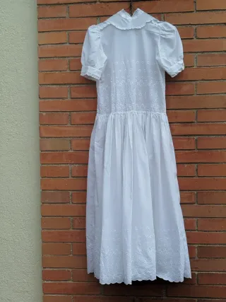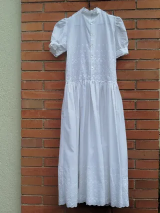 Vestido de batista bordada. Sin forrar. Abrochado por la espalda hasta la cintura. Falda con mucho vuelo. No lleva etiquetas ni de talla ni de composición. La talla proporcionada es orientativa. De axila a axila 40 cm , contorno de cintura 80 cm , de hombro a hombro 33 cm., largo desde el hombro 120 cm , vuelo de falda 3 mts 16. cm.con delicados bordados.