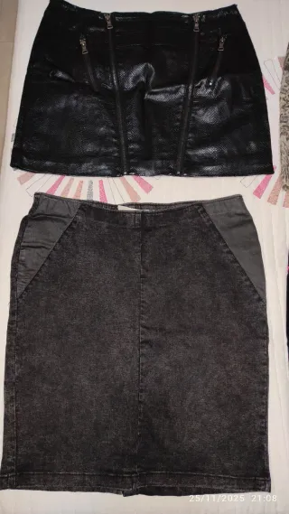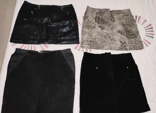 Lote de 4 faldas equivalentes a talla M 38 - L 40. Están en perfecto estado todas excepto la de la esquina superior izquierda, que tiene deteriorada la cintura, aunque con un jersey largo no se nota.