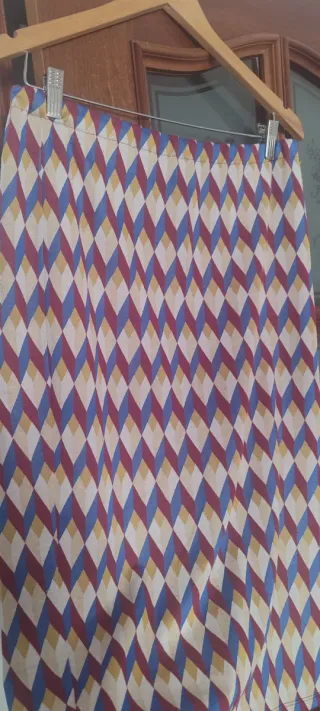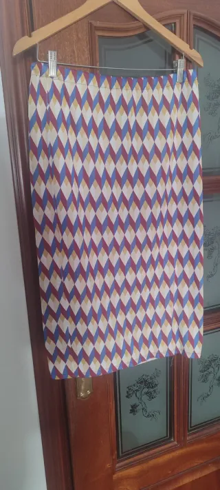 Falda midi con un llamativo estampado de rombos. - Diseño geométrico. - Cintura elástica para mayor comodidad. - Largo hasta la rodilla.