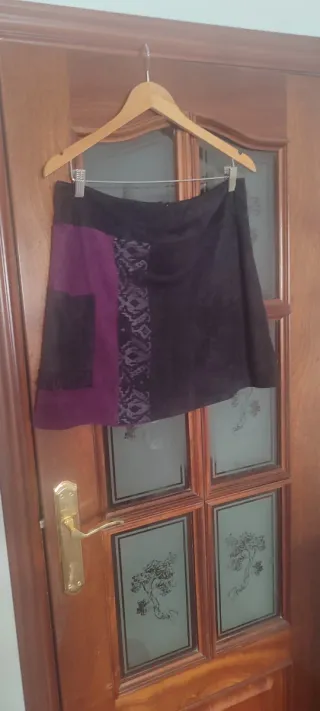Falda con un diseño original de ante que combina dos colores y texturas. - Panel lateral morado. - Detalle central de encaje. - Bolsillo frontal con flecos. -Solo usada una vez - Comprada en una boutique.