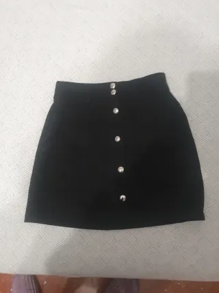 Falda corta de tela negra con botones plateados en la parte delantera. - Diseño de línea A. - Cierre de botones. - Cintura alta.