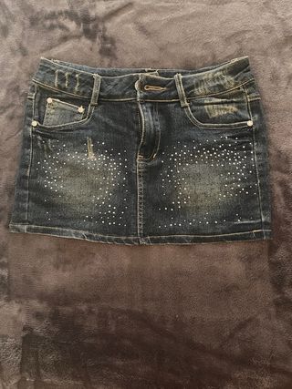 Mini falda vaquera en perfecto estado, como nueva. Un básico con un toque brillante. - Diseño de cinco bolsillos. - Cierre de cremallera y botón. - Adornada con pedrería. - Talla 34.