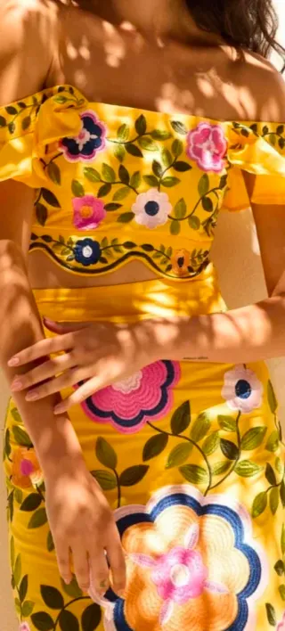 Conjunto de falda y top de la marca IQ Collection con un vibrante estampado floral.usado una vez super en tendencia Para fiesta su precio 235€ - Top con escote Bardot y mangas acampanadas. - Falda de corte recto con detalle de bordado. - Diseño llamativo y colorido.