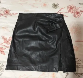Falda corta de polipiel con abertura lateral y drapeado delantero. - Diseño moderno y elegante. - Tacto suave y acabado brillante.