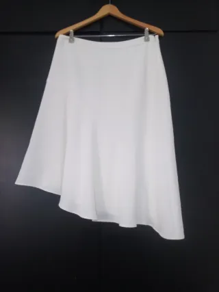 Falda de corte asimétrico con un diseño elegante. En perfecto estado. Talla 42. - Diseño asimétrico. - Color beige. - Medidas: Cintura: 42cm. Largo max: 78cm. Largo min: 61cm.
