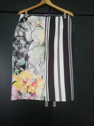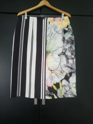 Falda con un diseño original que combina rayas y estampado floral. - Combinación de blanco, negro y toques de color. -Medidas: Cintura: 42cm. Bajo: 54cm.Largo: 64cm.