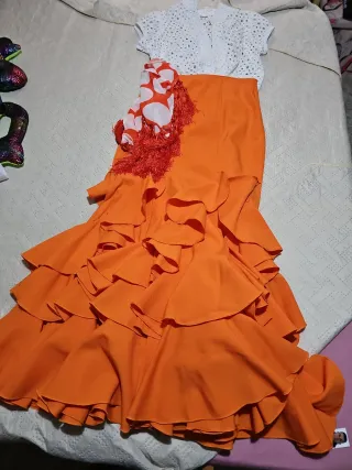 Falda de estilo flamenco con volantes. Corpiño marrón y camisa naranja a juego. - Diseño con estampado paisley. - Combinación de colores naranja y negro. - Talla 48-52 He puesto esa marca por poner una,no me deja dejarlo en blanco.
