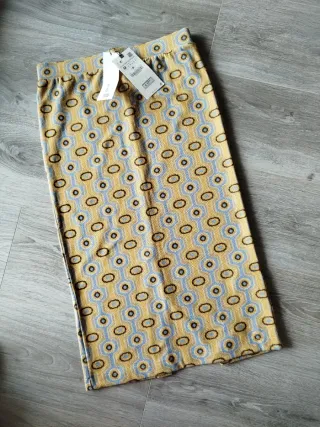 Falda midi de Zara, con un estampado geométrico llamativo en tonos amarillos, azules y marrones. Es una prenda nueva a estrenar, ideal para añadir un toque de color a tu armario. - Diseño midi. - Estampado geométrico. - Tejido de punto.