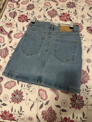 Falda vaquera corta de Stradivarius. - Diseño de botones frontales. - Bolsillos delanteros. - Costuras a contraste.