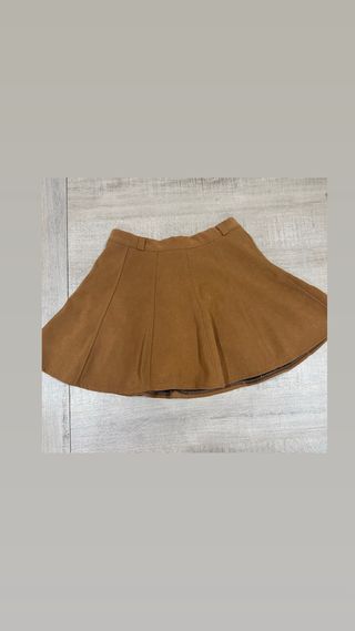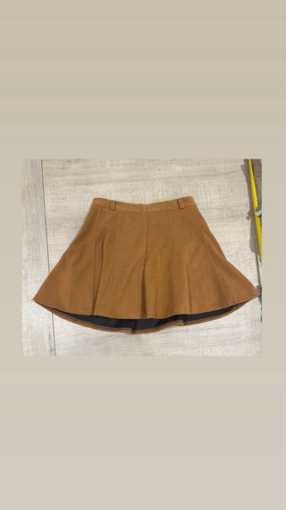 Falda corta de piel sintética en color marrón caramelo. - Diseño con vuelo. - Cintura con trabillas. - El short debajo ha sido cortado por el daño que tenía - Dice Talla L pero por favor revisar bien las medidas, yo pienso que sería una talla S
