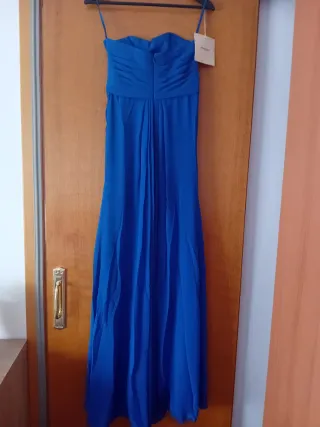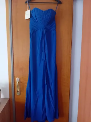 Elegante vestido de fiesta largo. - Diseño sin tirantes. - Cuerpo drapeado. - Falda con caída. - Cremallera lateral oculta.