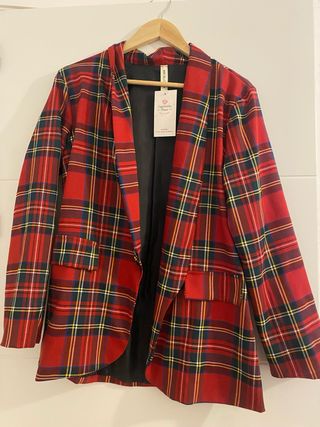 Conjunto de invierno compuesto por un blazer con estampado de cuadros de la marca Caperucita Rosa Navarro y una falda verde esmeralda de primark