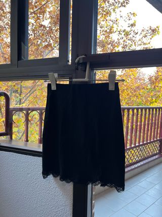 Falda elegante de color negro con un delicado detalle de encaje en el bajo. - Diseño con encaje en el dobladillo. - Corte moderno y favorecedor.