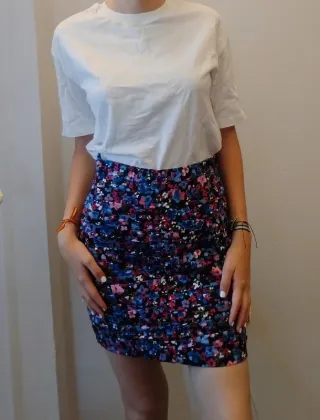 Preciosa minifalda, entallada, con estampado floral multicolor. - Ideal para cualquier ocasión. - Diseño tallado que se adapta a la figura. - Estampado floral colorido y alegre. - Perfecta para primavera/verano. - Está sin usar. - Largura perfecta. - Está hecha de Algodón y Elastano. PREGUNTA POR MEDIDAS